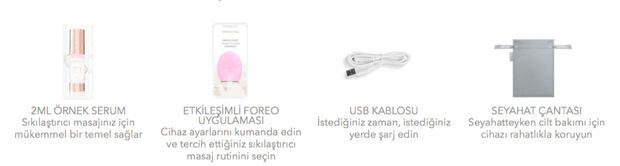 - Eser seyahat çantası, USB kablosunun yanı sıra sıkılaşmaya yardımcı masaj için örnek serum ile birlikte gönderiliyor. FOREO'nun kendi sitesinden bu serumu ayrıyeten da satın alabiliyorsunuz.